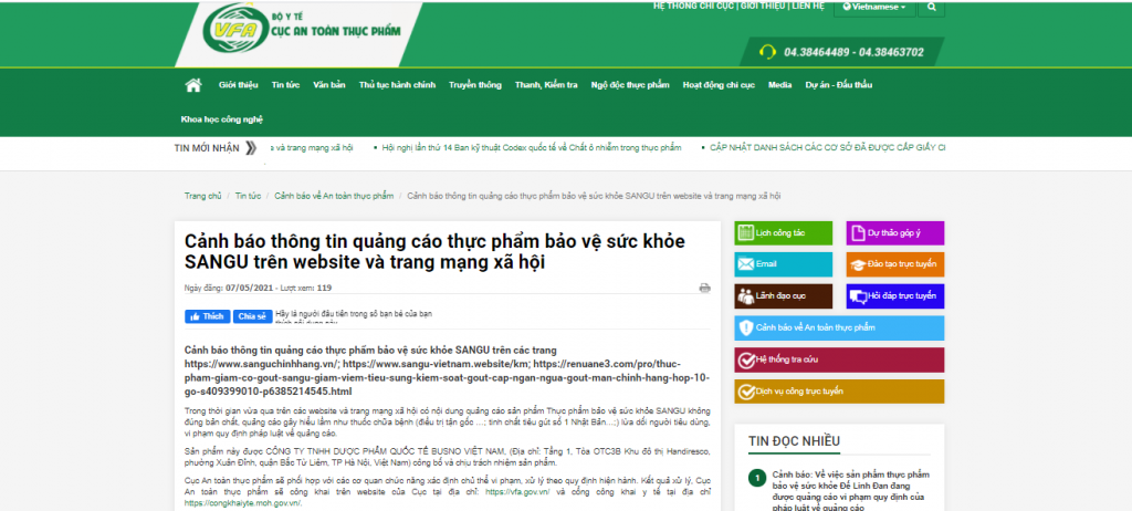 Cục An toàn thực phẩm (Bộ Y tế) vừa cảnh báo người tiêu dùng cẩn trọng khi mua thực phẩm bảo vệ sức khỏe SANGU trên website và trang mạng xã hội.