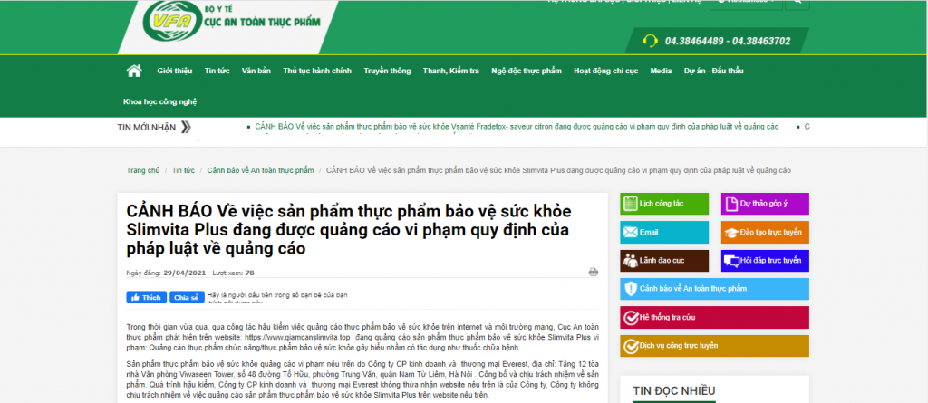 Trong thời gian vừa qua, qua công tác hậu kiểm việc quảng cáo thực phẩm bảo vệ sức khỏe trên internet và môi trường mạng, Cục An toàn thực phẩm phát hiện trên website: https://www.giamcanslimvita.top đang quảng cáo sản phẩm thực phẩm bảo vệ sức khỏe Slimvita Plus vi phạm: Quảng cáo thực phẩm chức năng/thực phẩm bảo vệ sức khỏe gây hiểu nhầm có tác dụng như thuốc chữa bệnh.