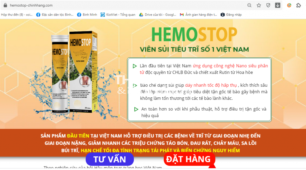 Nhưng, chỉ cần vào công cụ tìm kiếm của Google, gõ cụm từ “Viên sủi trĩ Hemostop” ngay lập tức khách hàng bị “bao vây” bởi nhiều website đang quảng cáo chào bán sản phẩm này: www.viensuihemostophn.com, www.hemostop-sakura.online, www.viensui-hemostop.online, www.hemostopchinhhang.xyz, www.hemostop-chinhhang.com, www.hemostop.icu, www.viensuitri.com, www.hemostop-chinhhang.tk, www.suitieutrihemostop.com, www.songkhoemoingay.icu, www.hemovn.com, www.viensuihemostophn.com,...với rất nhiều nội dung tung hô Viên sủi Hemostop như “thần dược”: “viên sủi tiêu trĩ công nghệ Đức”, “viên sủi teo co búi trĩ”, “hiệu quả gấp 98 lần thông thường”, “thành tựu thành công nhất cho người bệnh trĩ trong y học hiện đại vừa có tính an toàn vừa có tác dụng lâu dài”,…