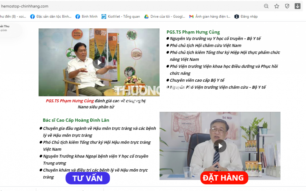 Ngoài viêc sử dụng ngôn từ để “khoa trương” sản phẩm như thuốc điều trị nhằm “chiếm đoạt” lòng tin của người dùng, các trang điện tử này cũng không ngần ngại đăng tải hàng loạt nội dung cảm ơn của người bệnh để quảng bá; đặc biệt, còn “hiên ngang” sử dụng hình ảnh, nội dung tư vấn của các Y bác sỹ, chuyên gia y tế như: PGS.TS Phạm Hưng Củng (Nguyên Vụ trưởng vụ Y học cổ truyền – Bộ Y tế), Bác sĩ Hoàng Đình Lân (Chuyên gia về hậu môn trực tràng, các bệnh lý về hậu môn trực tràng) để PR về công dụng của sản phẩm.