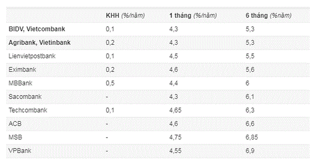 Các ngân hàng tư nhân cỡ lớn như MBBank, SHB, Sacombank, Techcombank, VPBank… hiện có lãi suất kỳ hạn này dao động trong khoảng 6-6,9%/năm.