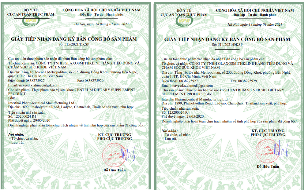 Được biết, TPBVSK Centrum 50+ Dietary Supplement Product, TPBVSK Centrum Dietary Supplement Product do Công ty TNHH Glaxosmithkline Hàng tiêu dùng và chăm sóc sức khỏe Việt Nam (Địa chỉ: Địa chỉ trụ sở chính: tầng 16, tòa nhà Metropolitan, số 235 đường Đồng Khởi, phường Bến Nghé, Quận 1, Thành phố Hồ Chí Minh) công bố và chịu trách nhiệm sản phẩm.