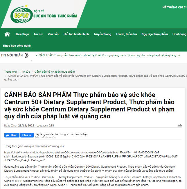 Cục An toàn thực phẩm (Bộ Y tế) vừa phát đi cảnh báo về việc sản phẩm Thực phẩm bảo vệ sức khỏe (TPBVSK) Centrum 50+ Dietary Supplement Product, TPBVSK Centrum Dietary Supplement Product vi phạm quy định của pháp luật về quảng cáo.
