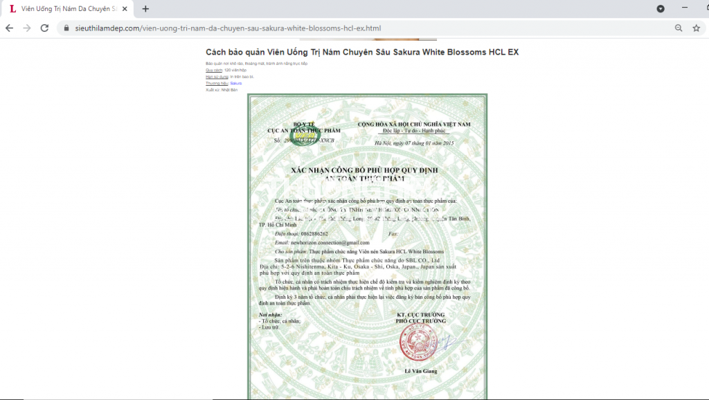 Thế nhưng khi đối chiếu với giấy xác nhận công bố phù hợp quy định An toàn thực phẩm (ATTP) được Cục ATTP cấp được Hệ thống Siêu thị Làm đẹp đã đăng kèm khi quảng cáo để tạo niềm tin cho khách hàng thể hiện đây là sản phẩm TPCN Viên nén SAKURA HCL WHITE BLOSSOMS. Giấy xác nhận được cơ quan chức năng cấp cho Công ty THNN New Horizon Connection từ năm 2015. Nếu chiểu theo quy định thì giấy xác nhận công bố này đã hết hiệu lực.