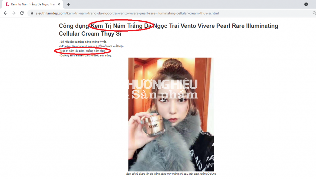 Cũng như TPCN, dòng mỹ phẩm của Siêu thị làm đẹp cũng được gắn các từ “Trị Nám’, “Trị thâm Nám’, “Kem Dưỡng Trắng Da Trị Nám”, “Kem Trị Nám Trắng Da”, “Thuốc Mọc Lông Mày”...Với những lời giới thiệu “thần thánh” này thì người tiêu dùng có thể hiểu nhầm rằng các sản phẩm mỹ phẩm trên có khả năng đặc trị, điều trị như thuốc chữa bệnh.