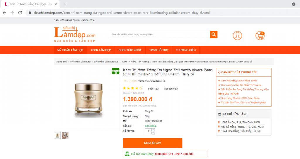 Bên cạnh các sản phẩm TPCN, trên Website https://sieuthilamdep.com/ còn quảng cáo bán hàng loạt các sản phẩm mỹ phẩm: Kem Trị Nám DongSung Rannce Cream 70g Hàn Quốc; Tinh Chất Trị Thâm Nám, Tàn Nhang SK-II GENOPTICS SPOT ESSENCE 50ml; Thuốc Mọc Lông Mày Revitabrow Advanced Eyebrow Conditioner 3ml Mẫu Mới; Kem Dưỡng Trắng Da Trị Nám Himalaya Herbal Whitening Cream Lanopearl Bio Peak; Kem Trị Nám Trắng Da Ngọc Trai Vento Vivere Pearl Rare Illuminating Cellular Cream Thụy Sĩ;...