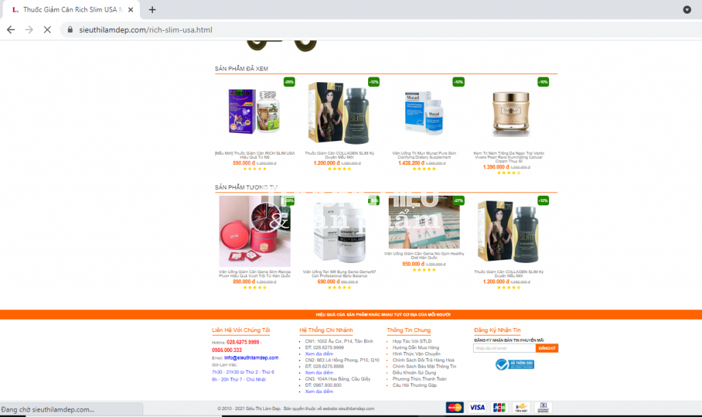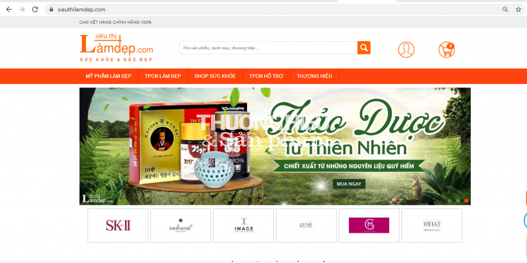 Cụ thể, trên Website https://sieuthilamdep.com/ đang quảng cáo bán hàng loạt các sản phẩm TPCN làm đẹp, TPCN hỗ trợ như: Viên Uống Trị Mụn, Xóa Sẹo Thâm Sakura AcnePill; Viên Uống Giảm Cân Genie Slim Recipe Plus+ Hiệu Quả Vượt Trội Từ Hàn Quốc; Viên Uống Trắng Da, Trị Nám, Tàn Nhang Transino Whitening; Viên Uống Trắng Da Trị Nám Beauty Diamond White Ngọc Trinh; Thuốc Giảm Cân COLLAGEN SLIM Kỳ Duyên Mẫu Mới; Thuốc Giảm Cân RICH SLIM USA Hiệu Quả Từ Mỹ; Viên Trắng Da Trị Nám Số 1 Của Mỹ Ivory Caps; Viên Uống Trị Mụn Murad Pure Skin Clarifying Dietary Supplement; Viên Uống Trị Nám Da Chuyên Sâu SAKURA WHITE BLOSSOMS HCL EX;....