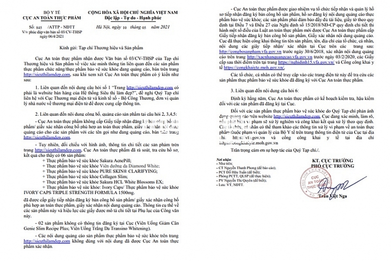 Cụ thể, tại Văn bản số 845/ATTP-NĐTT, ngày 10/5/2021 của Cục An toàn thực phẩm nêu rõ: Cục An toàn thực phẩm không cấp Giấy tiếp nhận đăng ký bản công bố sản phẩm/ giấy xác nhận công bố phù hợp an toàn thực phẩm, giấy xác nhận nội dung quảng cáo cho các sản phẩm với các tên gọi như đang quảng cáo, bán trên trang http://sieuthilamdep.com.
