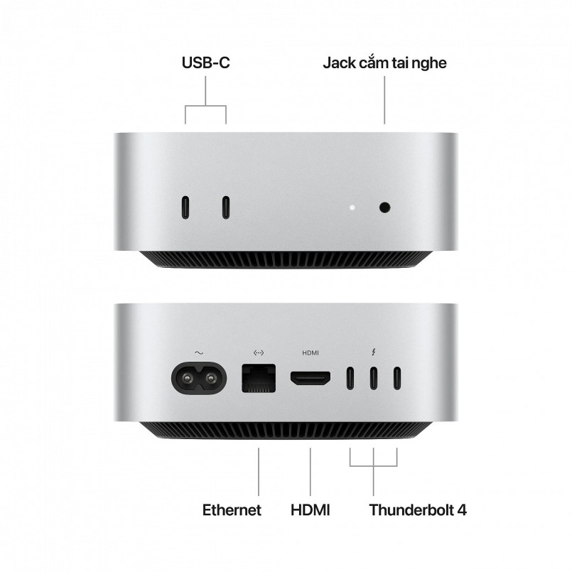 Máy được trang bị đa dạng cổng kết nối, bao gồm hai USB-C, giắc cắm tai nghe ở mặt trước, ba Thunderbolt 4, Gigabit Ethernet, và HDMI ở mặt sau. Riêng bản dùng chip M4 Pro sẽ lần đầu được tích hợp cổng Thunderbolt 5 chuẩn mới nhất với tốc độ 120 Gb/giây, gấp đôi thông lượng của chuẩn cũ.