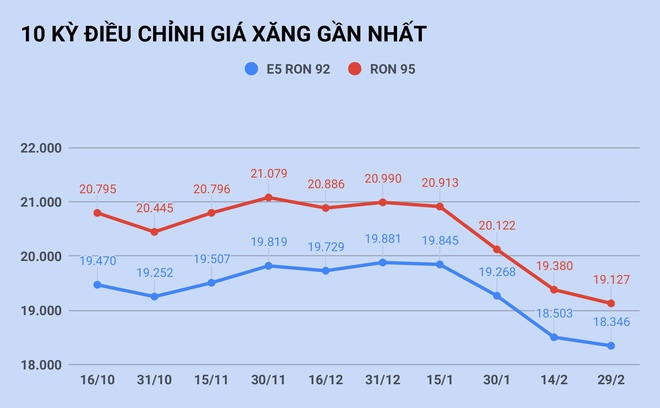 Biểu đồ thể hiện 10 kỳ điều chỉnh giá xăng gần nhất