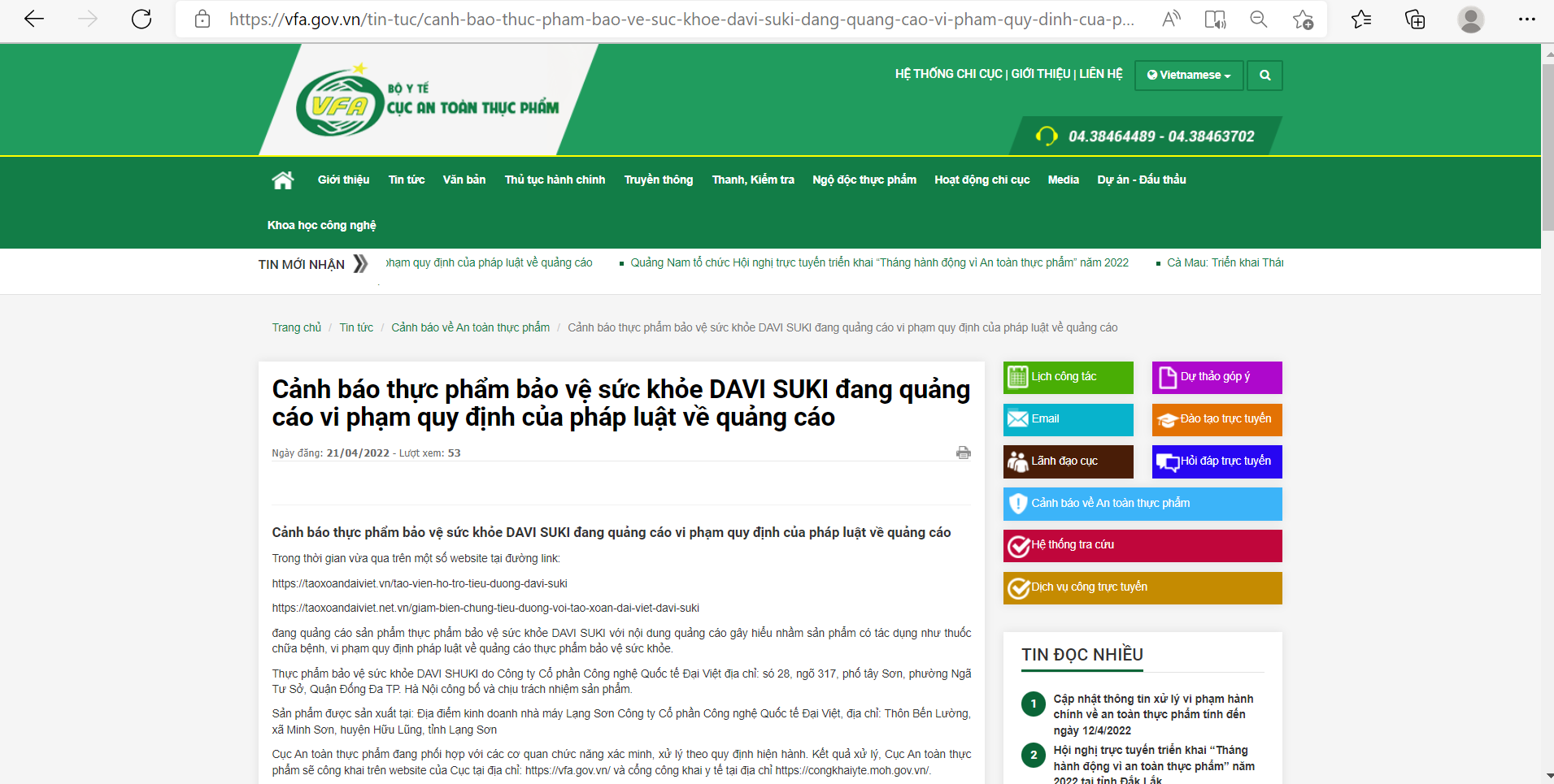 đang quảng cáo sản phẩm thực phẩm bảo vệ sức khỏe Davi Suki với nội dung quảng cáo gây hiểu nhầm sản phẩm có tác dụng như thuốc chữa bệnh, vi phạm quy định pháp luật về quảng cáo thực phẩm bảo vệ sức khỏe.