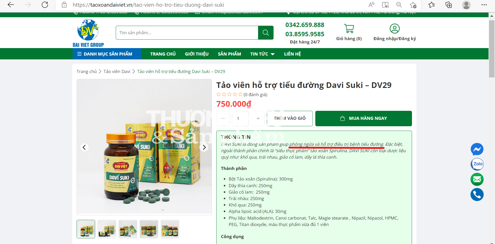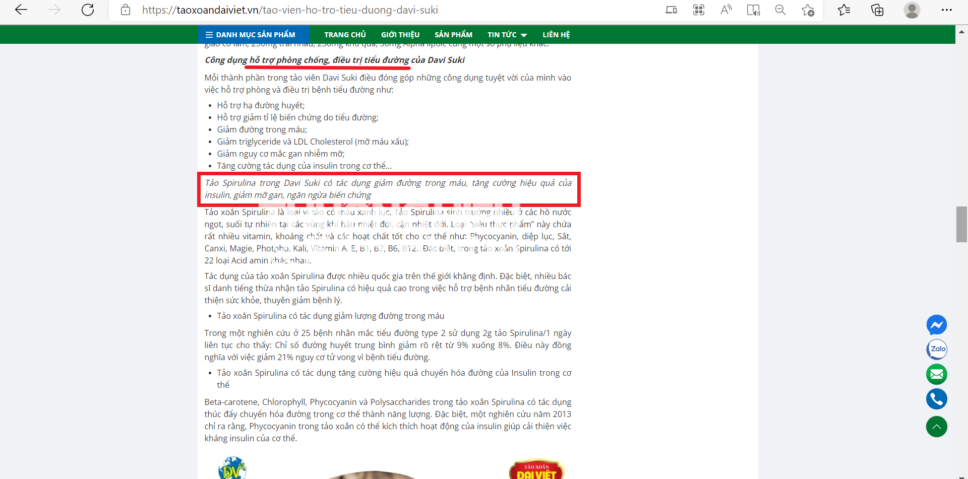 Không những vậy, tại mục thông tin sản phẩm, để tạo thêm niềm tin cho người tiêu dùng, tảo viên hỗ trợ tiểu đường Davi Suki còn được "nổ" với hàng loạt các công dụng: "Phòng ngừa và hỗ trợ điều trị tiểu đường hiệu quả, hỗ trợ phòng chống, điều trị tiểu đường... Sản phẩm này mở ra phương pháp hỗ trợ điều trị bệnh tiểu đường an toàn và hiệu quả cho hàng chục ngàn người bệnh".