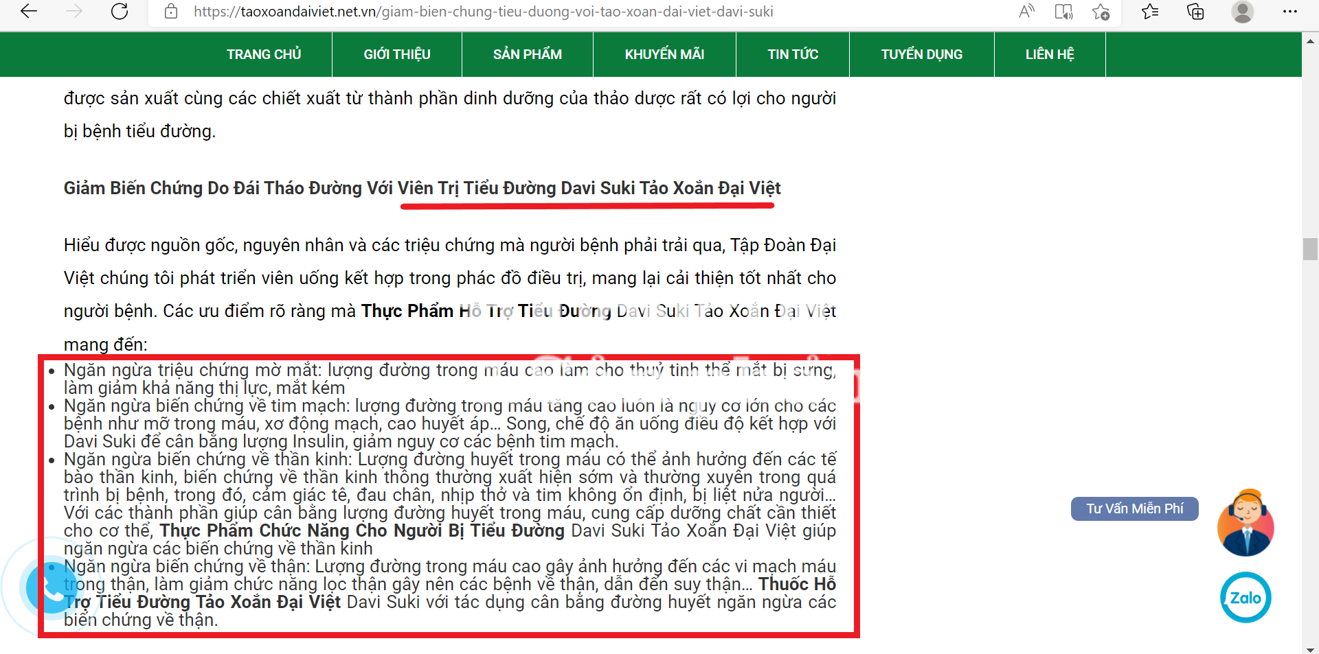 Còn tại website có địa chỉ link: https://taoxoandaiviet.net.vn/giam-bien-chung-tieu-duong-voi-tao-xoan-dai-viet-davi-suki sản phẩm TPBVSK Davi Suki liên tục "tra tấn" người tiêu dùng bằng những công dụng: "Ngăn Ngừa Biến Chứng Tiểu Đường, Viên Trị Tiểu Đường, Thuốc Hỗ Trợ Tiểu Đường, Thuốc Chống Biến Chứng Tiểu Đường, Ngăn Ngừa Rủi Ro Do Tiểu Đường..."