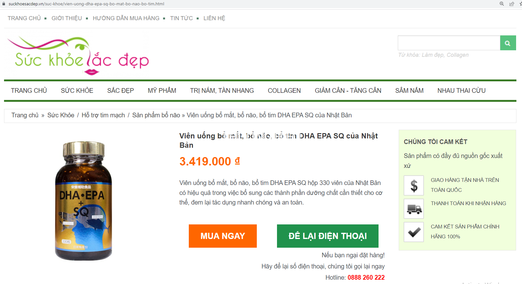 Còn tại https://suckhoesacdep.vn/suc-khoe/vien-uong-dha-epa-sq-bo-mat-bo-nao-bo-tim.html sản phẩm DHA.EPA + SQ được quảng cáo với hàn loạt các công dụng: “Bảo vệ mắt tránh khỏi tình trạng thoái hóa điểm vàng, đồng thời giúp dưỡng ẩm, làm giảm tình trạng khô mắt.; Ngăn ngừa và hỗ trợ điều trị chứng bệnh Alzheimer, cải thiện chứng rối loạn thần kinh, ...