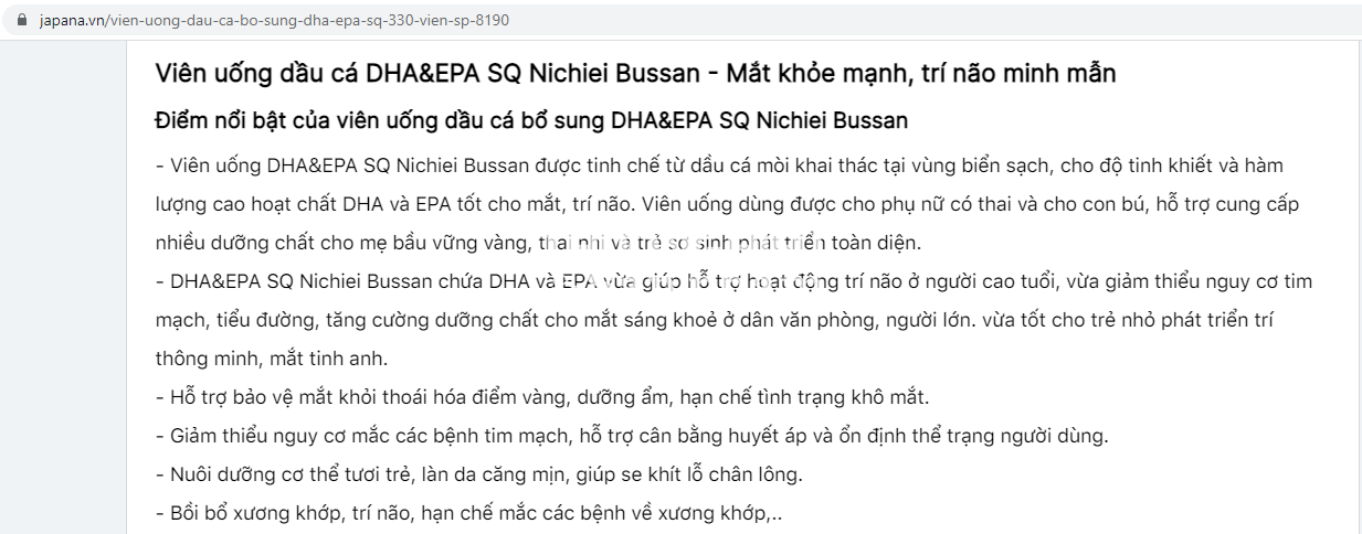 Website https://japana.vn nhấn mạnh: “Viên uống DHA&EPA SQ Nichiei Bussan được tinh chế từ dầu cá mòi khai thác tại vùng biển sạch, cho độ tinh khiết và hàm lượng cao hoạt chất DHA và EPA tốt cho mắt, trí não. Viên uống dùng được cho phụ nữ có thai và cho con bú, hỗ trợ cung cấp nhiều dưỡng chất cho mẹ bầu vững vàng, thai nhi và trẻ sơ sinh phát triển toàn diện.”