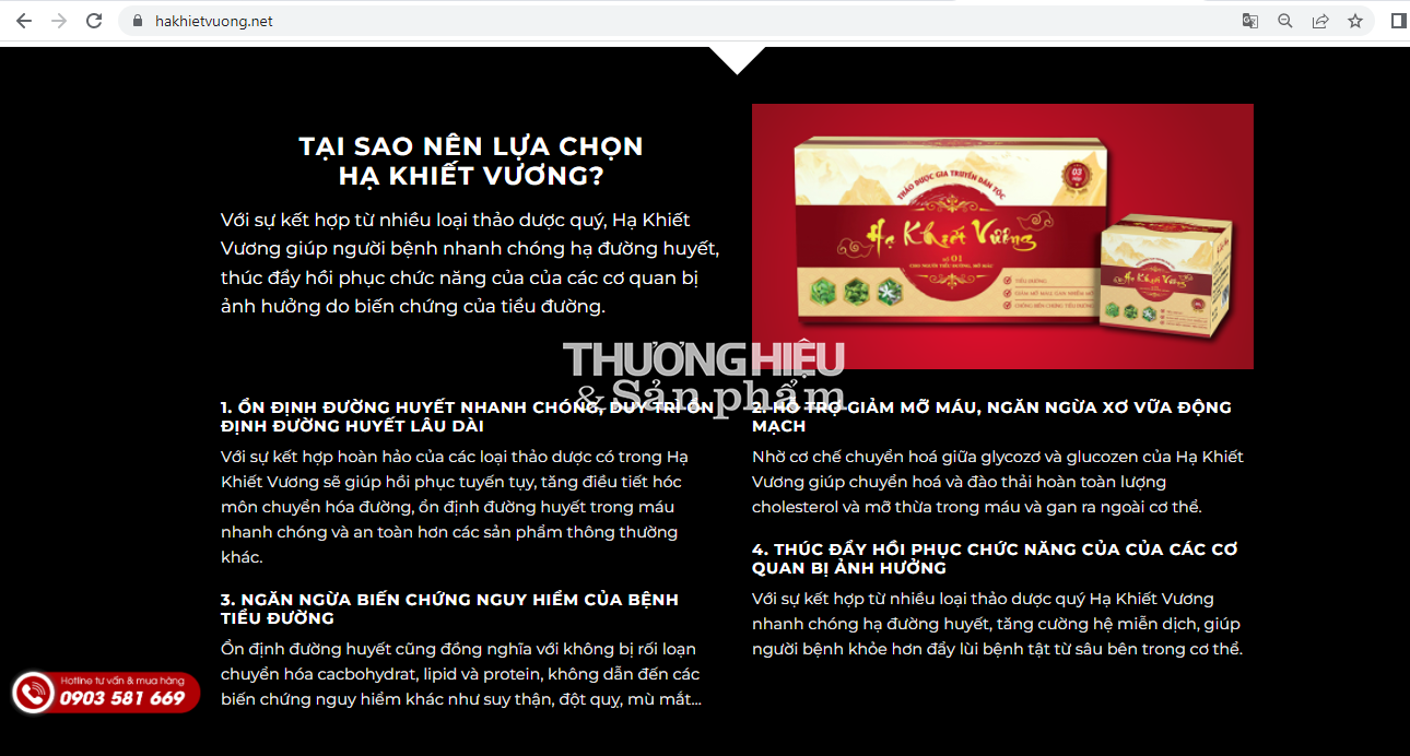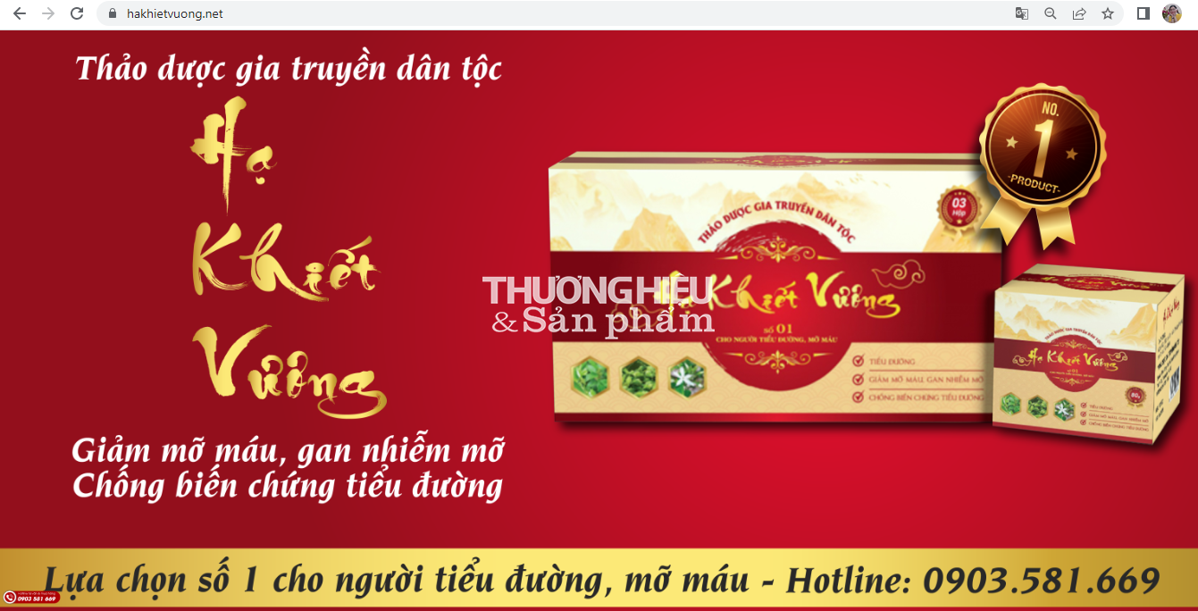 | Sản phẩm thực phẩm bảo vệ sức khỏe Hạ Khiết Vương được https://hakhietvuong.net/ quảng cáo có công dụng: “Giảm mỡ máu, gan nhiễm mỡ, chống biến chứng tiểu đường. Sản phẩm là lựa chọn số 1 cho người tiểu đường, mỡ máu". |