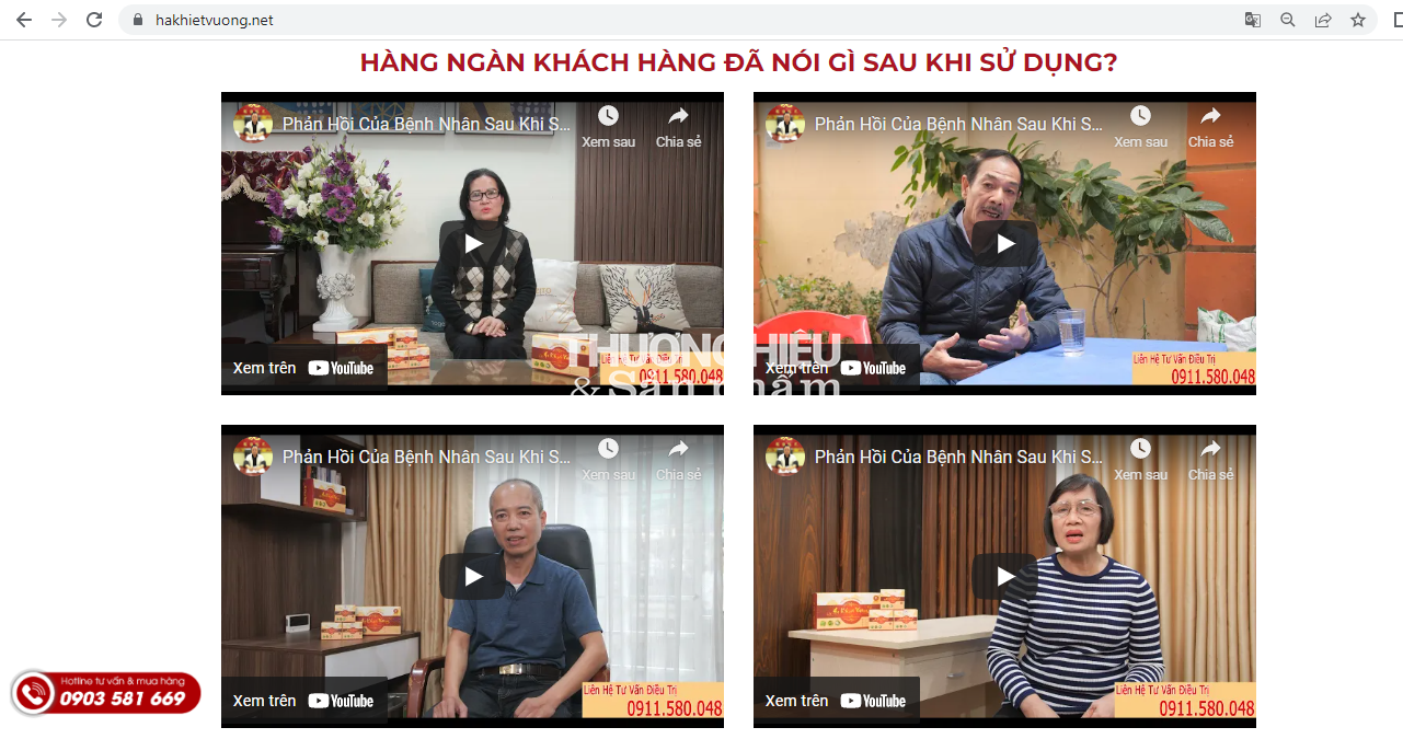 Để tăng niềm tin đối với người tiêu dùng https://hakhietvuong.net/ còn đăng kèm hàng loạt các video của khách hàng nói về sản phẩm Hạ Khiết Vương. Những thông tin của khách hàng nói về sản phẩm Hạ Khiết Vương khiến người xem hiểu lầm sản phẩm này có công dụng trị bệnh tiểu đường, mõ máu.