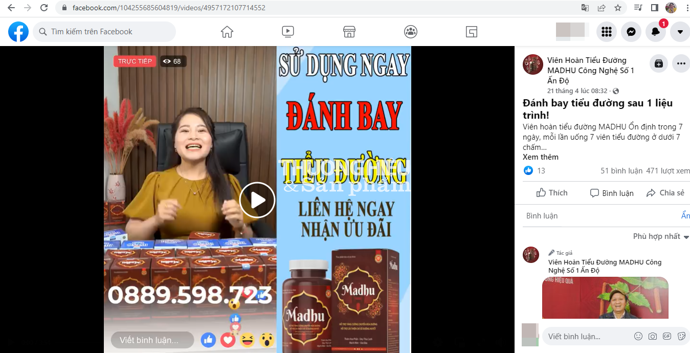 Hay tại Facebook “Viên Hoàn Tiểu Đường MADHU Công Nghệ Số 1 Ấn Độ” - đường link https://www.facebook.com/104255685604819/videos/4957172107714552/, sản phẩm TPBVSK MadHu được quảng cáo có thể “đánh bay tiểu đường” và “phòng ngừa, ngăn chặn biến chứng nguy hiểm”.