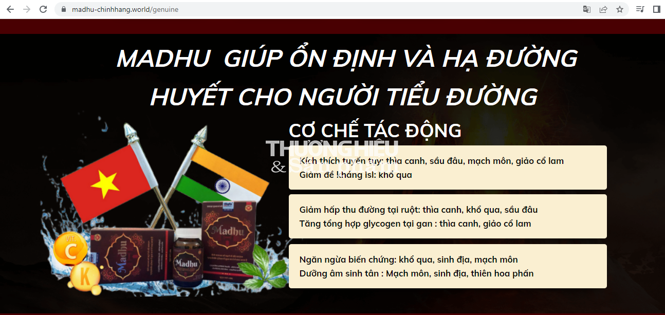 Theo khảo sát của Phóng viên ngày 10/5/2022, tại đường link https://www.madhu-chinhhang.world/genuine, TPBVSK MadHu được quảng cáo là “Tập trung giải quyết nguyên nhân gốc rễ tiểu đường, chức năng trao đổi chất”, “Xóa đi nỗi lo về biến chứng do tây y mang lại. Ức chế sự phát triển của các tổ chức xơ hóa ở thận của người bệnh”.