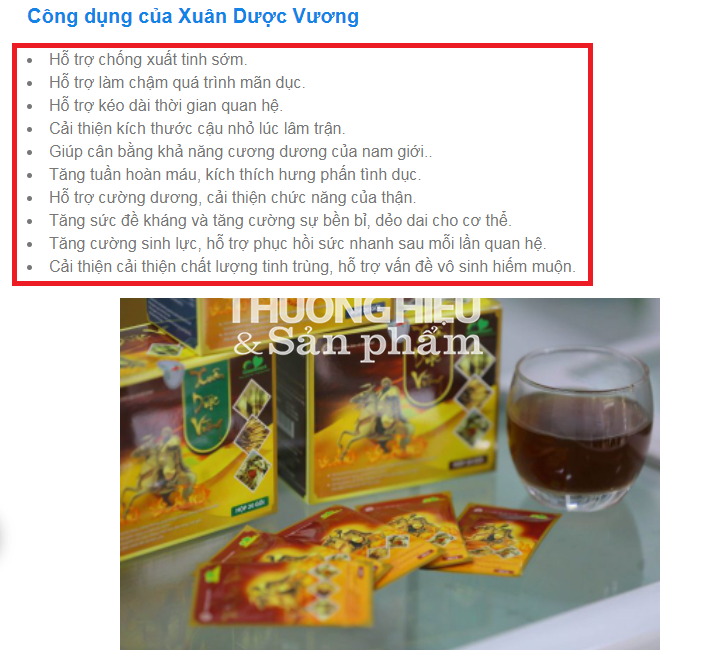 Cụ thể, sản phẩm thực phẩm bảo vệ sức khỏe Xuân Dược Vương được quảng cáo với hàng loạt công dụng: "Hỗ trợ làm chậm quá trình mãn dục; Cải thiện kích thước cậu nhỏ lúc lâm trận; Giúp cân bằng khả năng cương dương của nam giới; Hỗ trợ cường dương, cải thiện chức năng của thận; Tăng sức đề kháng và tăng cường sự bền bỉ, dẻo dai cho cơ thể; Tăng cường sinh lực, hỗ trợ phục hồi sức nhanh sau mỗi lần quan hệ; Cải thiện cải thiện chất lượng tinh trùng, hỗ trợ vấn đề vô sinh hiếm muộn.”