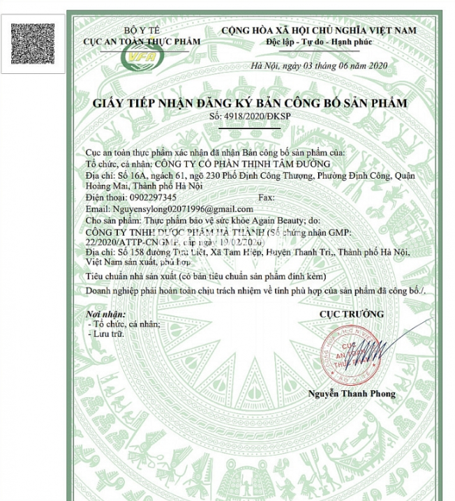 Được biết, sản phẩm Again Beauty do Công ty Cổ phần Thịnh Tâm Đường (địa chỉ: số 16A, ngách 61, ngõ 230 phố Định Công Thượng, phường Định Công, quận Hoàng Mai, thành phố Hà Nội) công bố và chịu trách nhiệm sản phẩm.