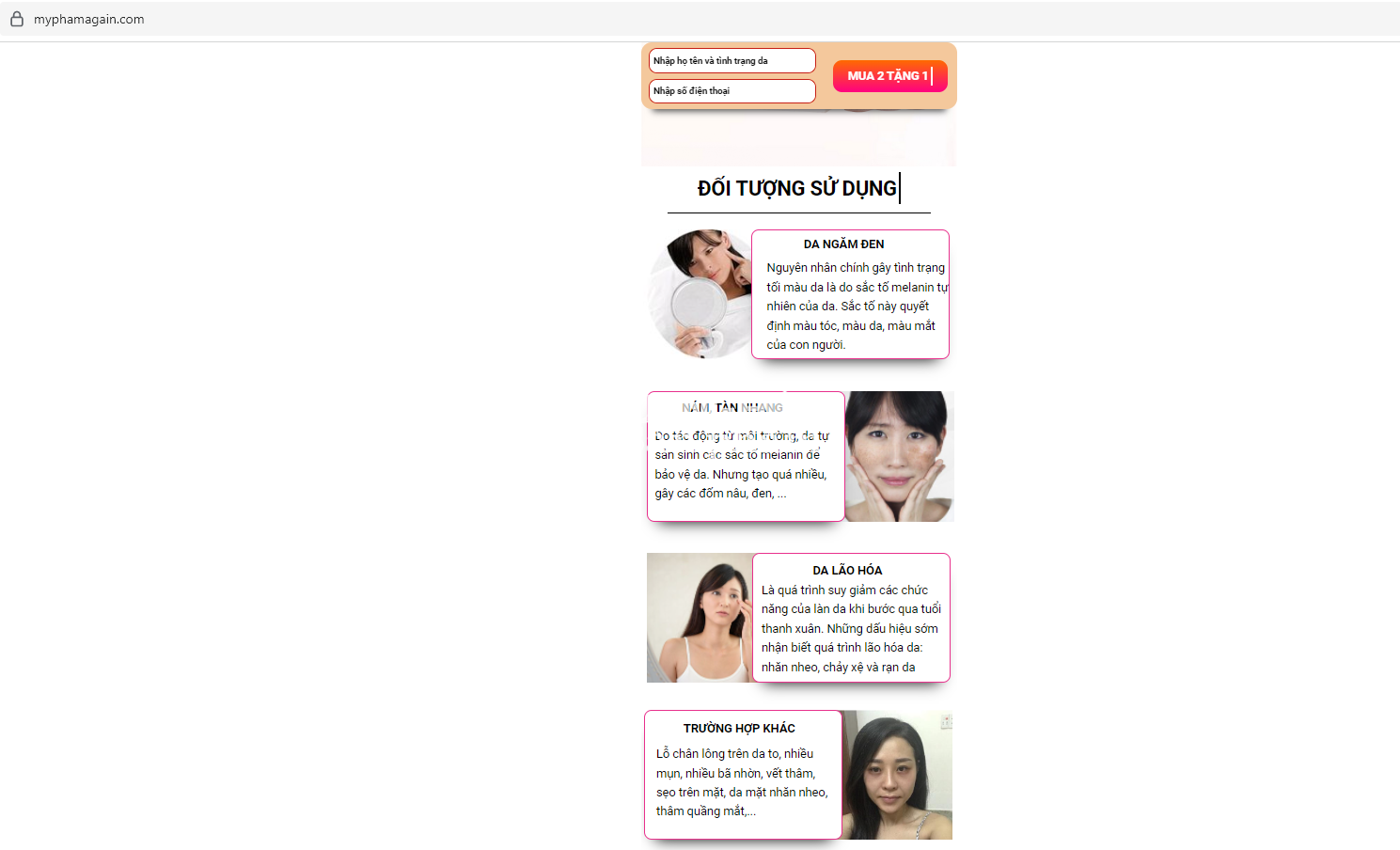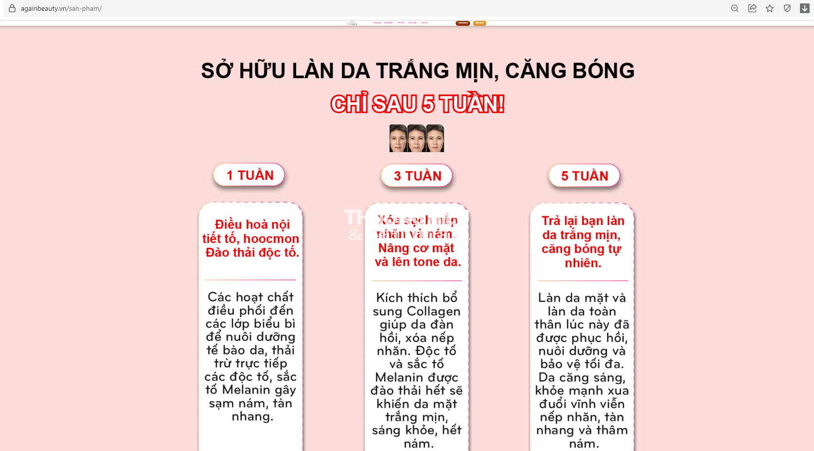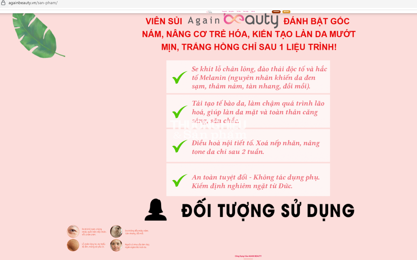 Còn trên https://againbeauty.vn/ sản phẩm Again Beauty được quảng cáo có công dụng: Se khít lỗ chân lông, đào thải độc tố và sắc tố Melanin (nguyên nhân khiến đen da sạm, thâm nám, tàn nhang, đồi mồi).