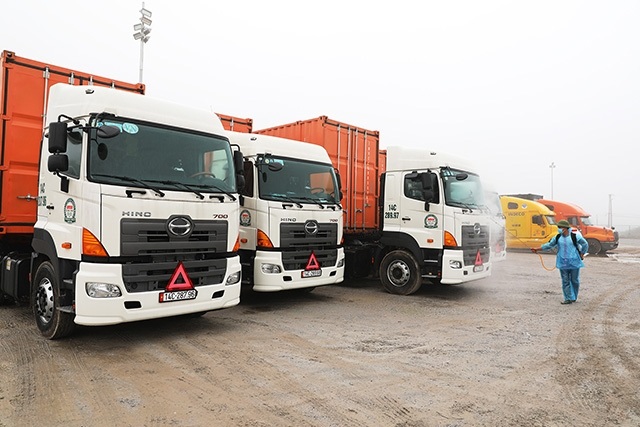 Các phương tiện tại bãi kiểm hóa của Công ty cổ phần XNK quốc tế Tân Đại Dương (TP Móng Cái, Quảng Ninh) được phun thuốc khử trùng trước khi thông quan.