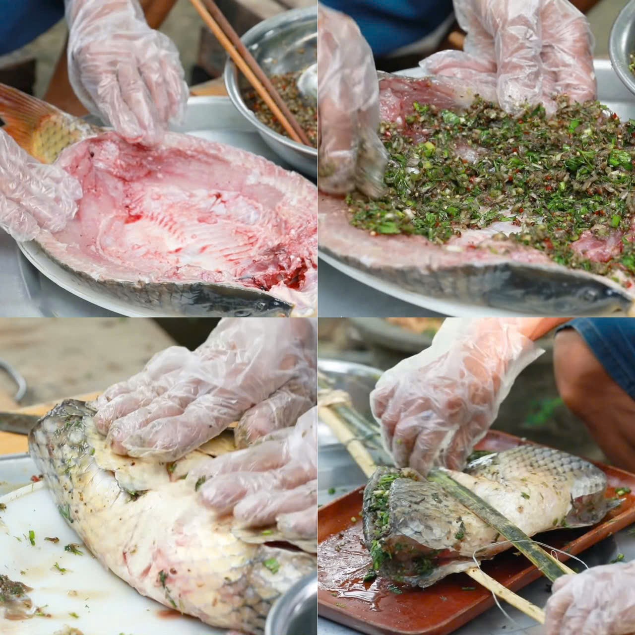 Tất cả gia vị giã nhuyễn, băm nhỏ rồi trộn đều, xoa khắp mình cá, rồi nhét đầy gia vị vào bụng cá – chỗ hương vị được “ủ” kỹ nhất, giúp cá thơm nức mũi sau khi nướng.