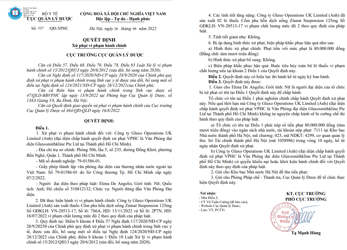Theo quyết định xử phạt, Công ty Glaxo Operations UK Limited (Anh) đã thực hiện hành vi vi phạm sản xuất thuốc Cốm pha hỗn dịch uống Zinnat Suspension 125mg Số GĐKLH: VN-20513-17, Số lô: 7S6A, HD: 13/11/2022 và Số lô: 2P7N, HD: 16/07/2022 vi phạm chất lượng mức độ 2 theo quy định của pháp luật.