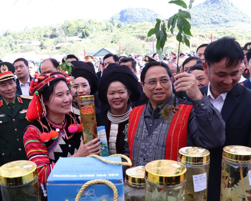 Trong chuyến công tác tại tỉnh Lai Châu vào trung tuần tháng 11/2023, Thủ tướng Chính phủ Phạm Minh Chính đã tới thăm khu trồng Sâm của Công ty cổ phần nông nghiệp công nghệ cao Thái Minh. Đánh giá cao việc đầu tư bài bản với những công nghệ hiện đại của doanh nghiệp, việc huy động người dân bản địa tham gia vào các khâu chăm sóc Sâm, tặng Sâm giống cho người dân để nhằm mở rộng diện tích trồng, từng bước giúp cuộc sống người dân thoát nghèo… Thủ tướng Chính phủ Phạm Minh Chính cho rằng, tỉnh Lai Châu có nguồn giống Sâm quý nên việc bảo tồn, phát triển là việc làm hết sức cần thiết. Thủ tướng đặc biệt nhấn mạnh “chính quyền địa phương, doanh nghiệp cần thực hiện tốt liên kết "4 nhà" trong phát triển và xây dựng "thương hiệu" Sâm Lai Châu, để cây Sâm sẽ tạo nguồn thu nhập, tạo động lực trong phát triển kinh tế cho đồng bào địa phương”.