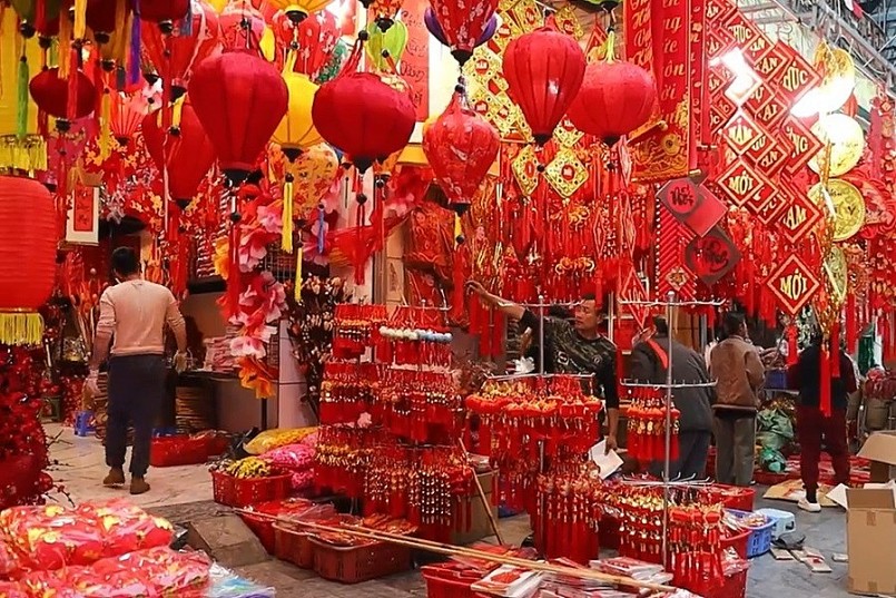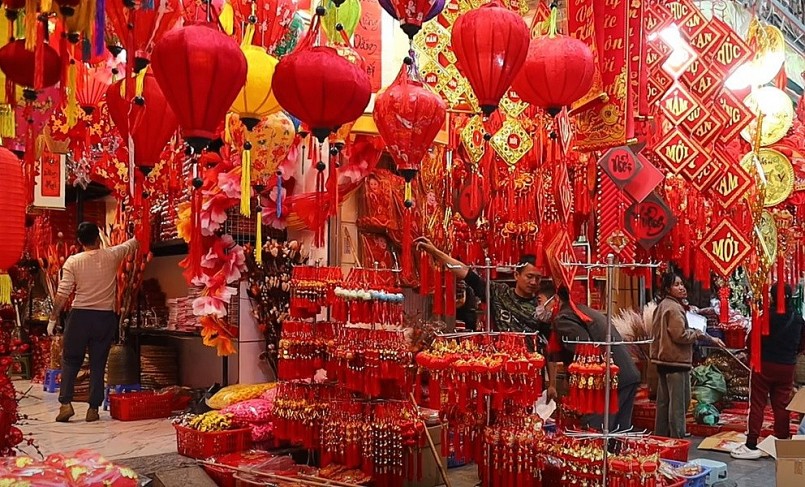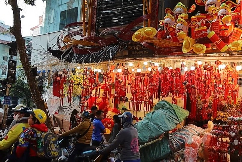 | Những ngày này, các cửa hàng trên phố Hàng Mã (quận Hoàn Kiếm, TP. Hà Nội) đều "khoác áo mới" rực rỡ sắc màu cho Tết Nguyên đán Ất Tỵ. |