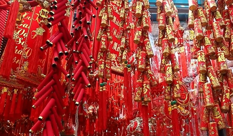| Đa phần đồ trang trí Tết xuất hiện trong thời điểm này chủ yếu là các dây pháo giấy, đồng tiền vàng có giá từ 150.000-300.000 đồng tùy vào độ to nhỏ và sự tinh xảo. |