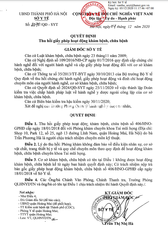 Quyết định nêu rõ: Thu hồi giấy phép hoạt động khám bệnh, chữa bệnh số 406/HNO-GPHĐ cấp ngày 18/01/2018 đối với Phòng khám chuyên khoa Tai mũi họng (Địa chỉ: Shop 10, Park 12, số 25, ngõ 13 đường Lĩnh Nam, quận Hoàng Mai, TP Hà Nội) do bà Trần Phương Hà là người chịu trách nhiệm chuyên môn kỹ thuật.