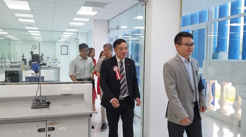| Dược sỹ Nguyễn Xuân Hoàng – Chủ tịch Hội đồng sáng lập VIDS - Phó Chủ tịch Hiệp hội Thực phẩm chức năng Việt Nam (véc đen dẫn các vị đại biểu đi tham quan các phòng thí nghiệm của Viện hực phẩm chức năng) |