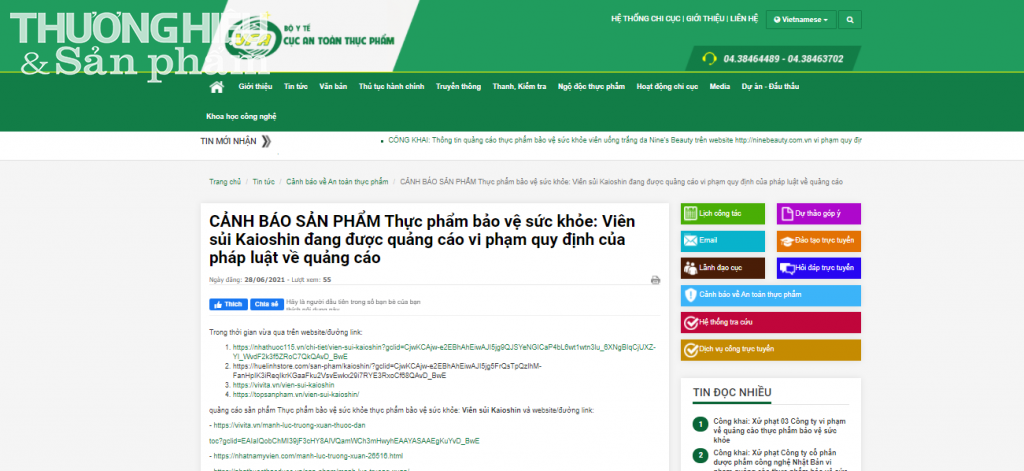 Cục An toàn thực phẩm đã xác minh đối với tổ chức công bố các sản phẩm thực phẩm bảo vệ sức khỏe: Viên sủi Kaioshin (là Công ty Cổ phần Thịnh Tâm Đường). Theo đó, Công ty Cổ phần Thịnh Tâm Đường khẳng định không thực hiện quảng cáo 02 sản phẩm trên các website nêu trên.