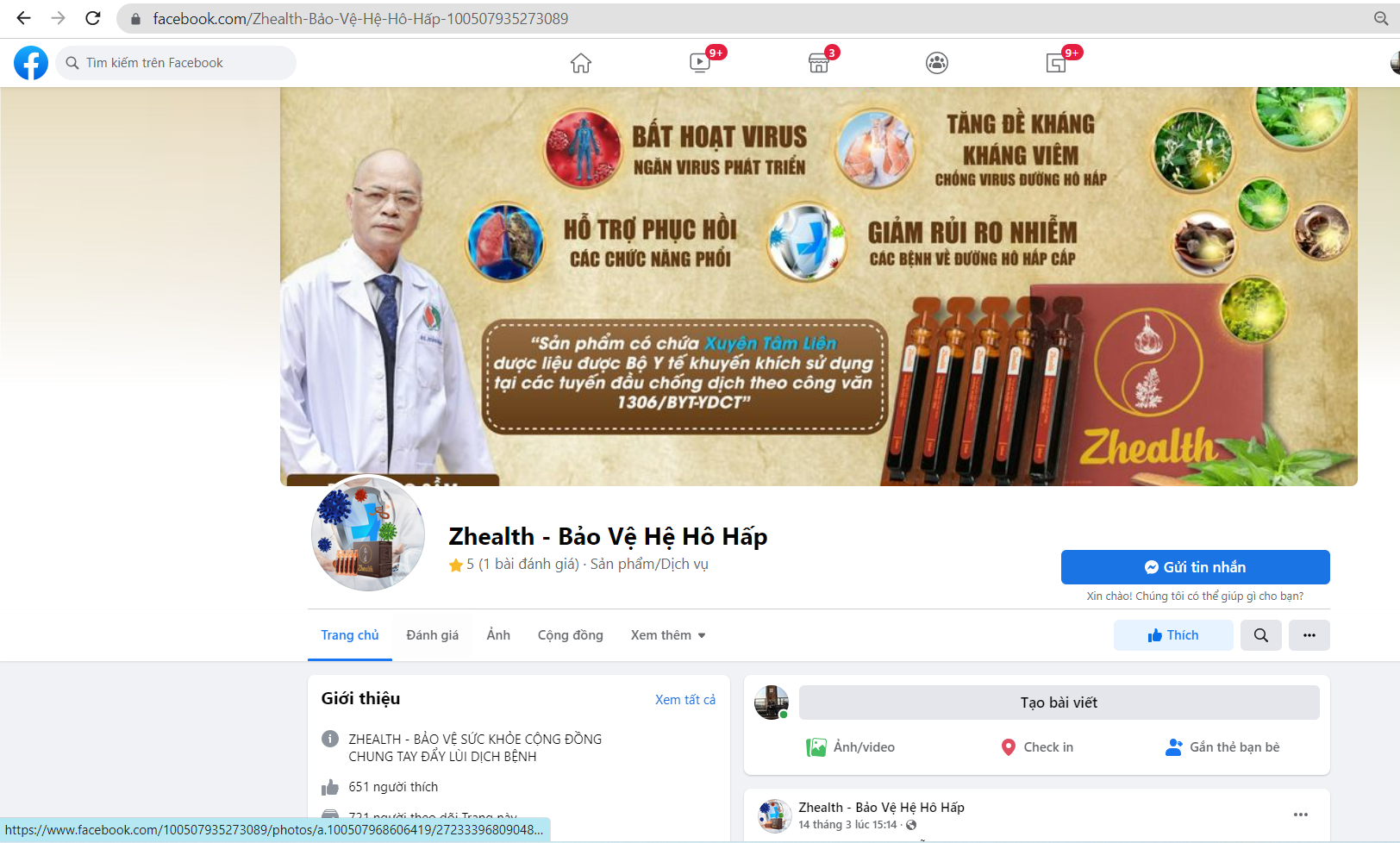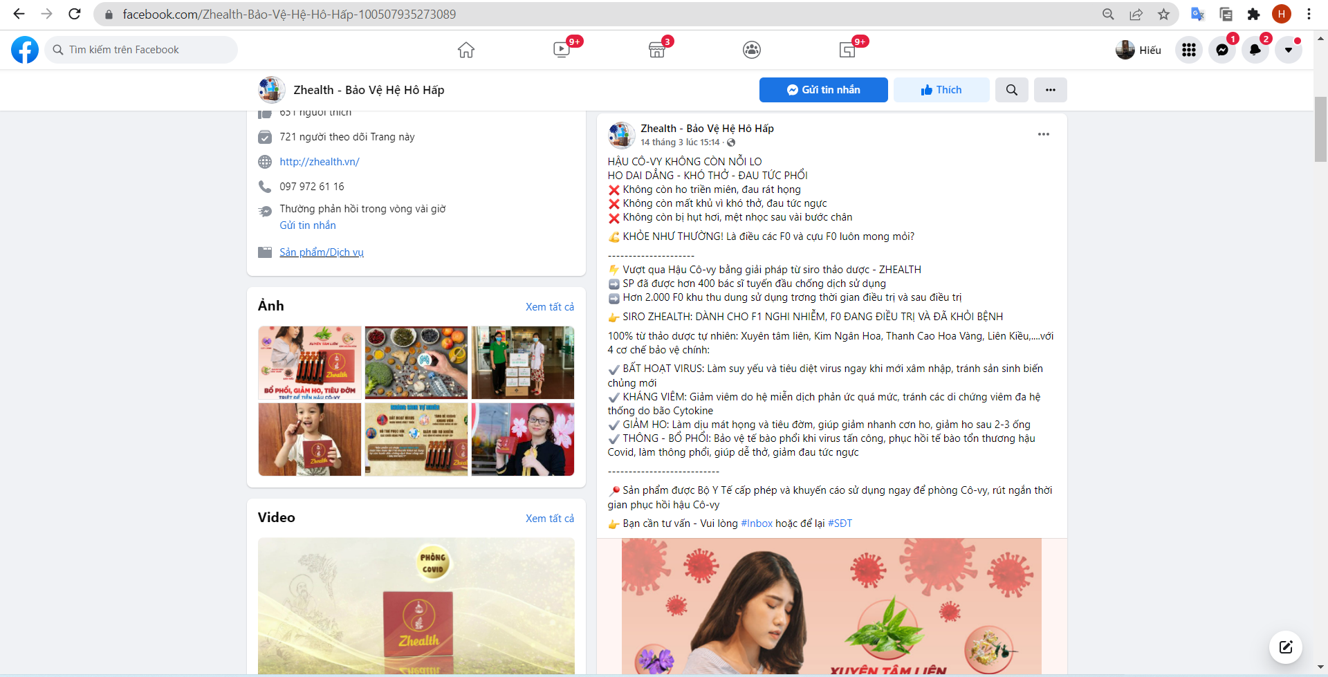 Cụ thể, tại website https://zhealth.vn/ và https://www.facebook.com/Zhealth-B%E1%BA%A3o-V%E1%BB%87-H%E1%BB%87-H%C3%B4-H%E1%BA%A5p-100507935273089 sản phẩm Zhealth được “nhấn mạnh” về thành phần và công dụng của sản phẩm như: Bổ phổi, giảm ho, tiêu đờm, triệt để tiền hậu Co-vy, thanh lọc phổi, phục hồi tế bào bị tổn thường, diệt virus, ngăn ngừa virus sản sinh biến chủng mới, ngăn ngừa và điều trị hậu Covid – 19, ....