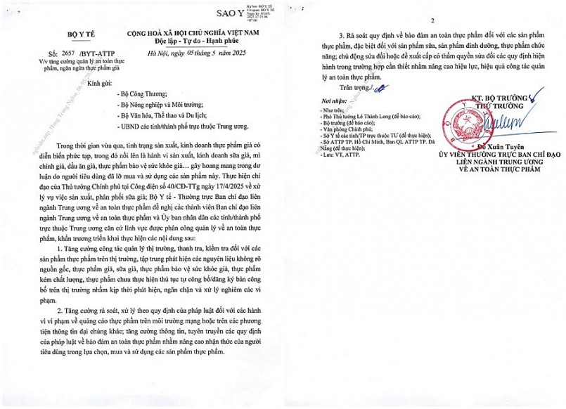 | Công văn số 2657/BYT-ATTP ngày 5/5/2025 yêu cầu các cơ quan chức năng căn cứ vào lĩnh vực được phân công, khẩn trương triển khai các biện pháp tăng cường kiểm soát. |