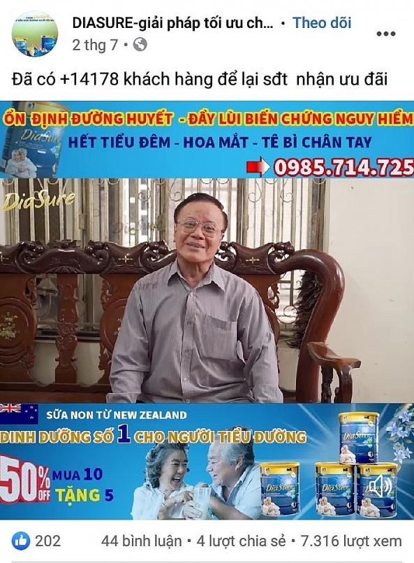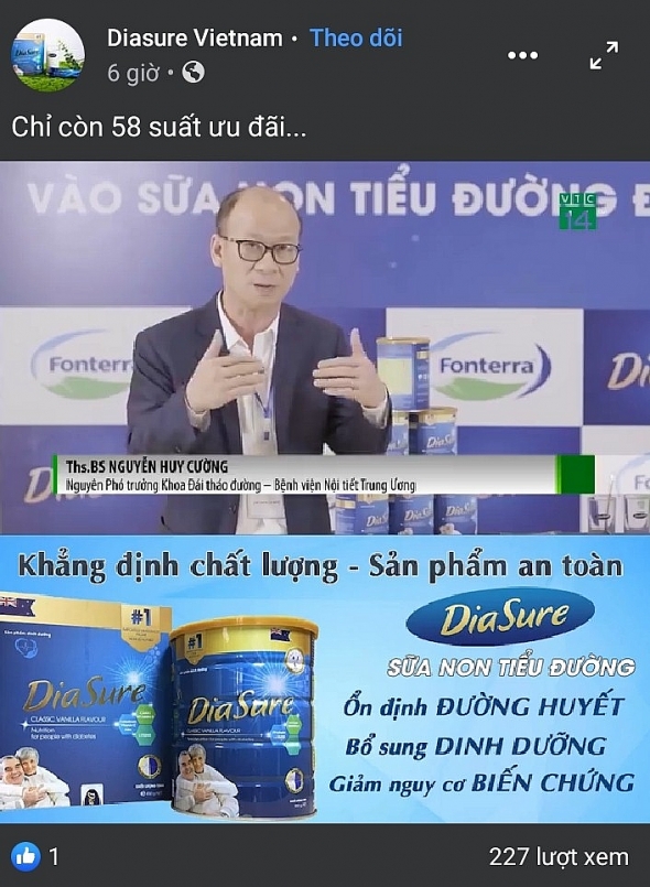 Bên cạnh đó, để khẳng định tác dụng của sản phẩm, tạo sự tin tưởng cho người tiêu dùng, các trang mạng này còn đăng tải hình ảnh, ý kiến của bác sĩ, người nổi tiếng như: Ths.Bs. Nguyễn Huy Cường, Nghệ sĩ nhân dân Thanh Hoa, Nghệ sĩ Văn Tùng, Ca sĩ Dương Ngọc Thái và nhiều người bệnh không rõ địa chỉ khác. Đơn cử như bà Hồ Thị Quạt (làm giúp việc ở TP Hồ Chí Minh), chia sẻ thông tin uống Sữa tiểu đường Diasure sau hai tháng thì đường huyết từ 18 chấm xuống còn 8 chấm…