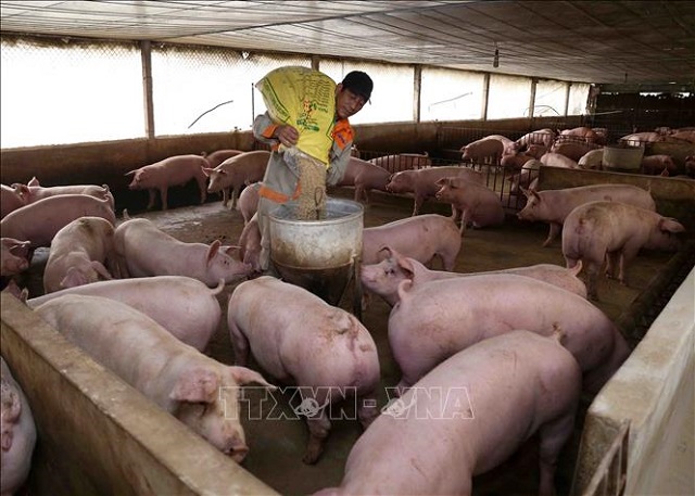 Người dân xã Tiên Kiên, huyện Lâm Thao chăm sóc đàn lợn thịt chuẩn bị xuất chuồng tại trang trại. Ảnh: Vũ Sinh/TTXVN