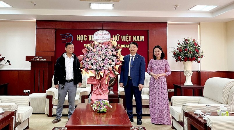 Tiếp đón đại diện Tạp chí Thương hiệu và Sản phẩm có ông Trần Quang Tiến - Giám đốc Học viện Phụ nữ Việt Nam; TS Lại Thị Hải Bình - Trưởng Khoa Truyền thông đa phương tiện.