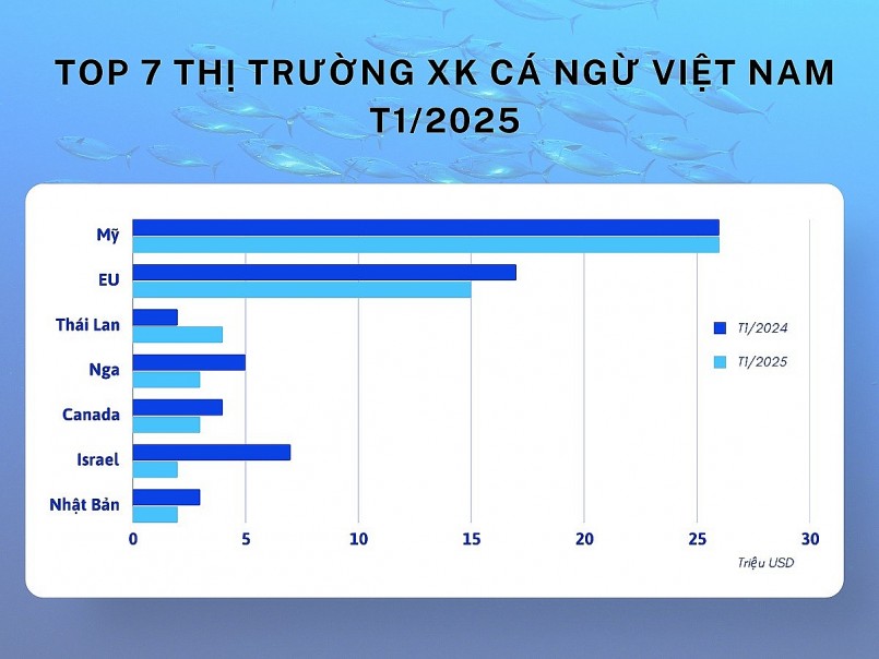 Theo Hiệp hội Chế biến và Xuất khẩu Thủy sản Việt Nam (VASEP) xuất khẩu cá ngừ của Việt Nam trong tháng 1/2025 sang các thị trường xuất khẩu chính như Mỹ, EU, Israel, Nhật Bản, hay Canada… đều đang giảm so với cùng kỳ.