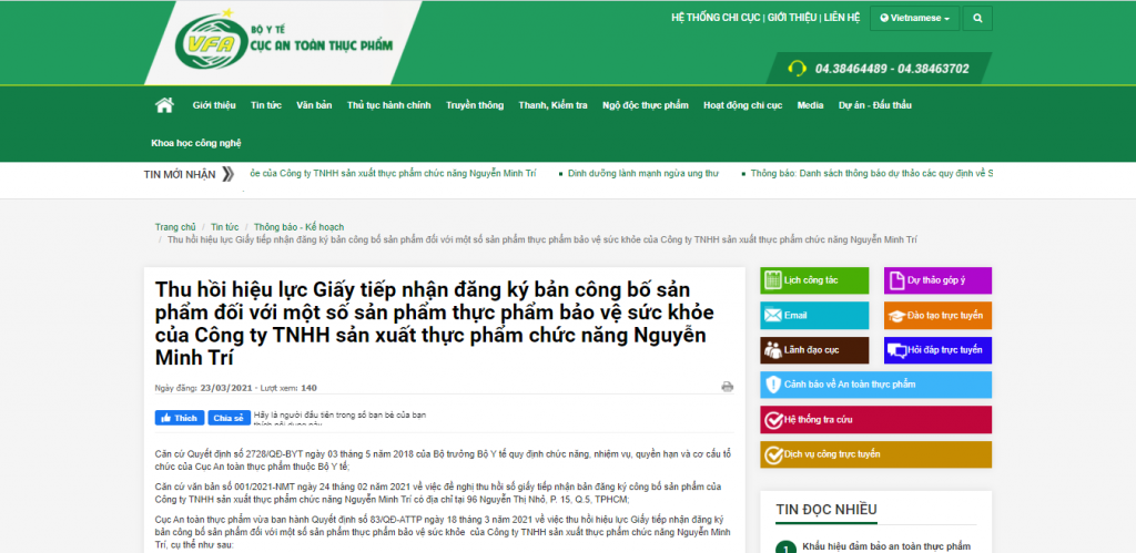 Cục An toàn thực phẩm vừa ban hành Quyết định số 83/QĐ-ATTP ngày 18 tháng 3 năm 2021 về việc thu hồi hiệu lực Giấy tiếp nhận đăng ký bản công bố sản phẩm đối với một số sản phẩm thực phẩm bảo vệ sức khỏe của Công ty TNHH sản xuất thực phẩm chức năng Nguyễn Minh Trí.