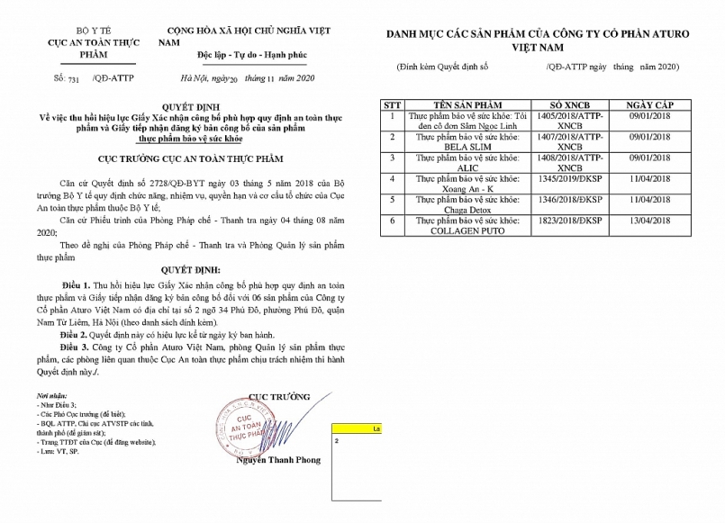 Cục An toàn thực phẩm – Bộ Y tế đã ban hành quyết định thu hồi hiệu lực Giấy xác nhận công bố phù hợp quy định an toàn thực phẩm đối với 6 sản phẩm TPCN của Công ty Cổ phần Aturo Việt Nam.