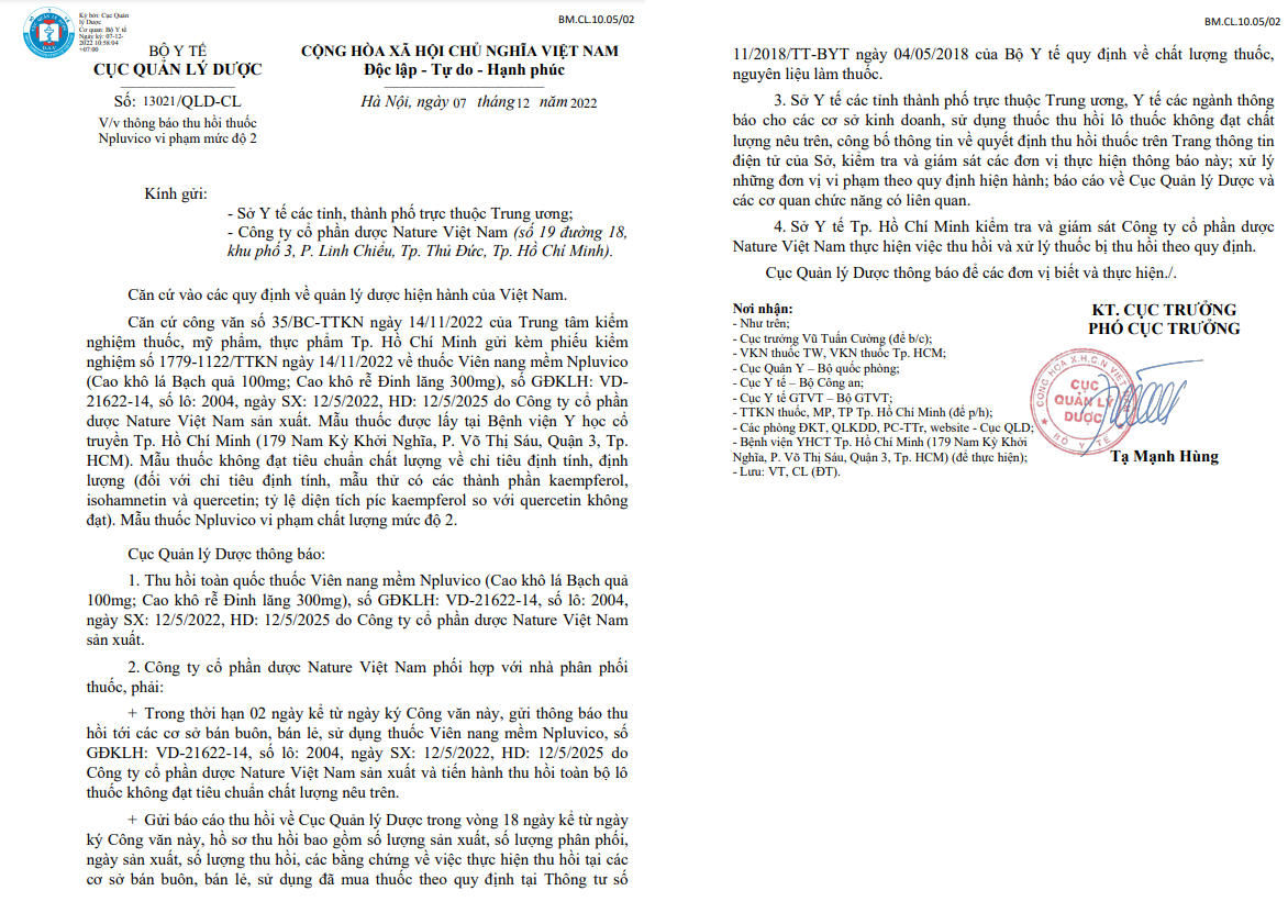 Cục Quản lý Dược cũng yêu cầu Công ty cổ phần dược Nature Việt Nam phối hợp với nhà phân phối thuốc, trong thời hạn 02 ngày kể từ ngày ký Công văn này, gửi thông báo thu hồi tới các cơ sở bán buôn, bán lẻ, sử dụng thuốc Viên nang mềm Npluvico, số GĐKLH: VD-21622-14, số lô: 2004, ngày SX: 12/5/2022, HD: 12/5/2025 do Công ty cổ phần dược Nature Việt Nam sản xuất và tiến hành thu hồi toàn bộ lô thuốc không đạt tiêu chuẩn chất lượng nêu trên.