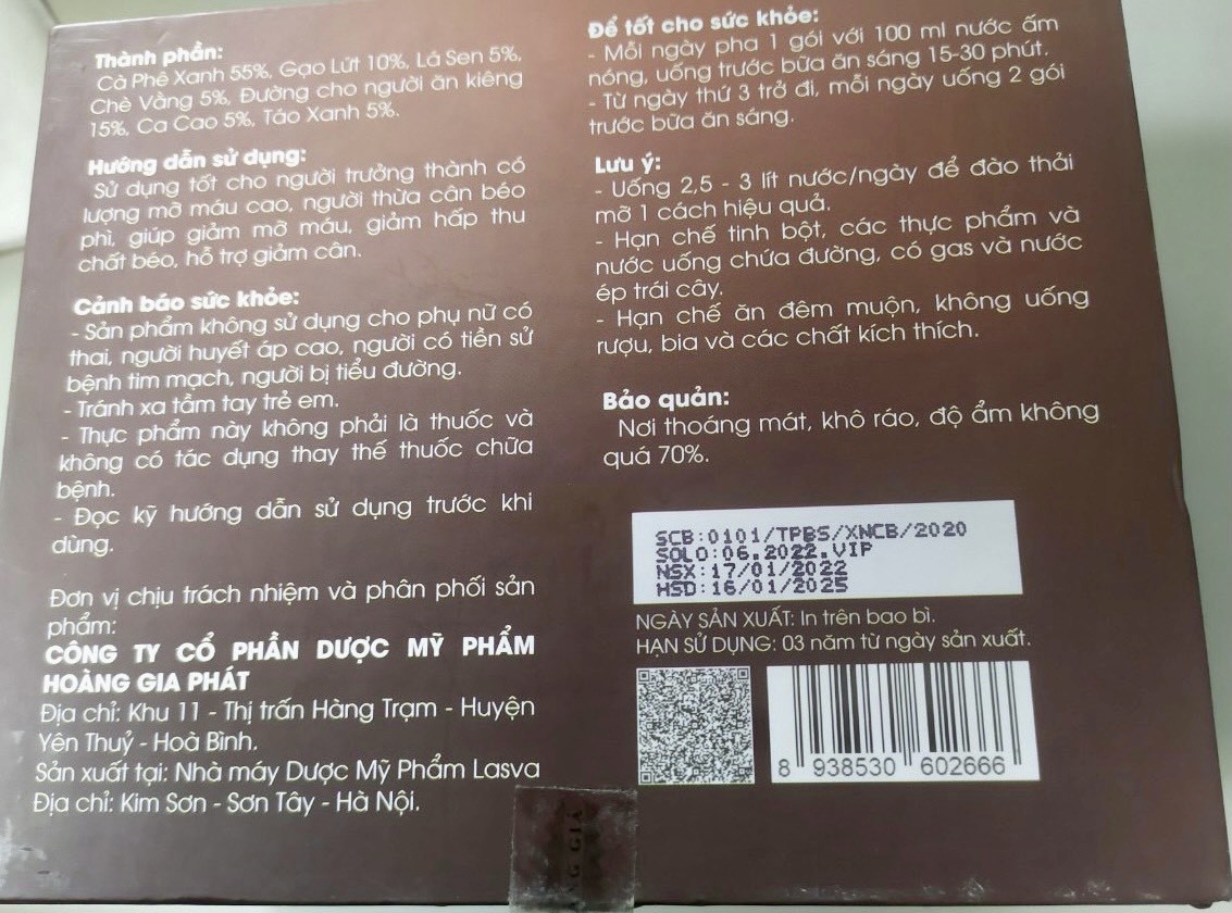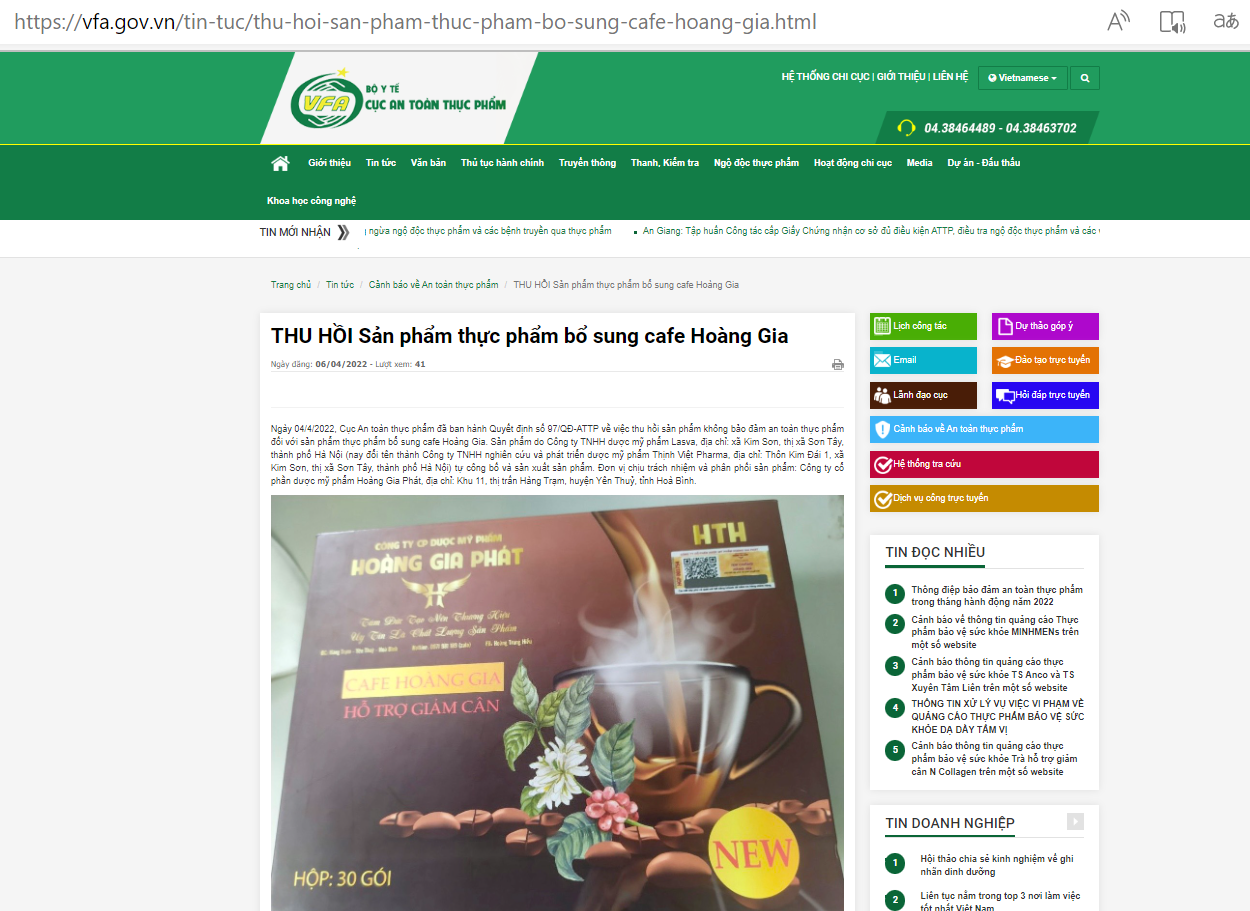Sản phẩm bổ sung cafe Hoàng Gia do Công ty TNHH dược mỹ phẩm Lasva, địa chỉ: xã Kim Sơn, thị xã Sơn Tây, thành phố Hà Nội (nay đổi tên thành Công ty TNHH nghiên cứu và phát triển dược mỹ phẩm Thịnh Việt Pharma, địa chỉ: Thôn Kim Đái 1, xã Kim Sơn, thị xã Sơn Tây, thành phố Hà Nội) tự công bố và sản xuất sản phẩm.