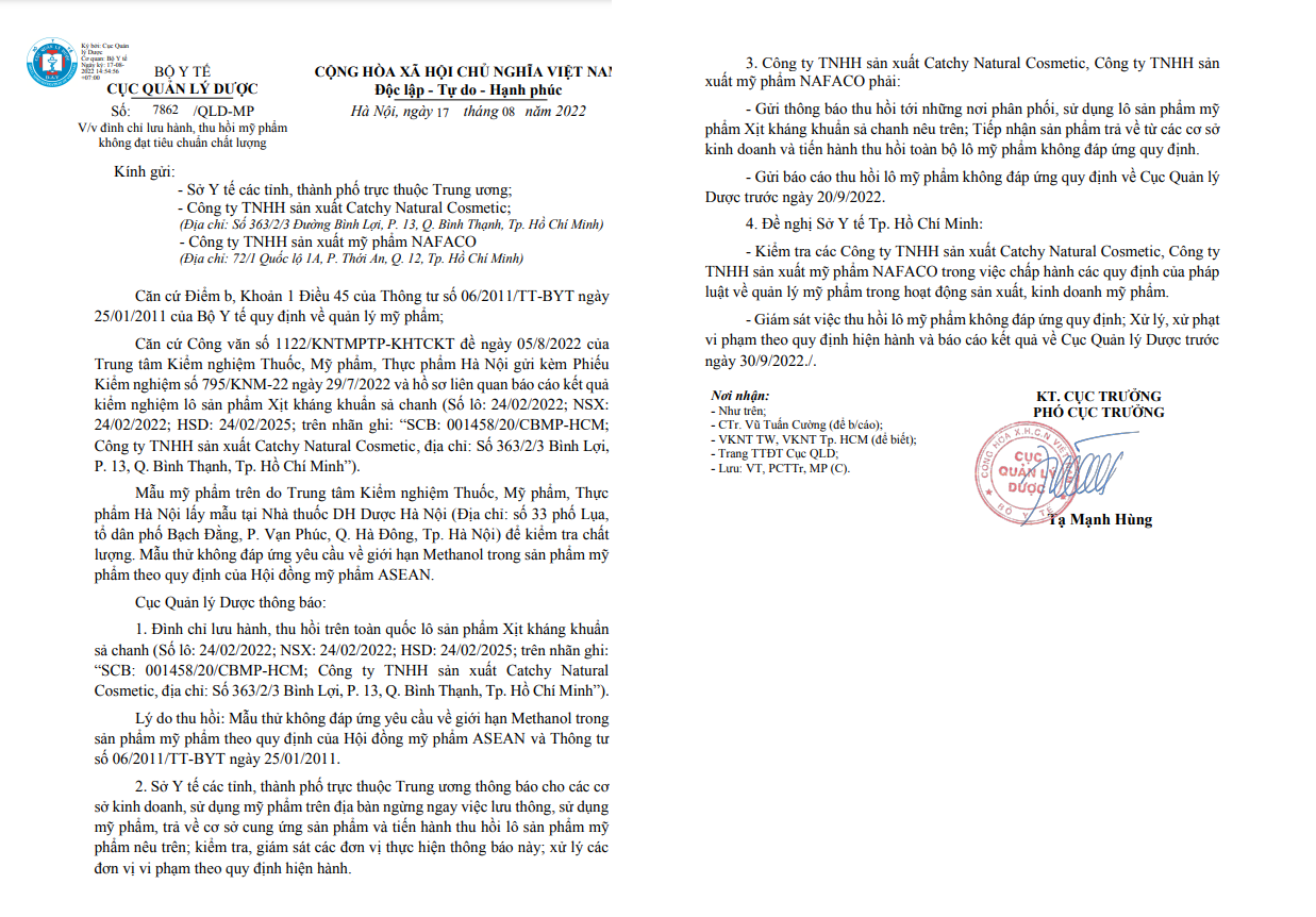 Đối với Công ty TNHH sản xuất Catchy Natural Cosmetic, Công ty TNHH sản xuất mỹ phẩm NAFACO, Cục Quản lý Dược yêu cầu phải gửi thông báo thu hồi tới những nơi phân phối, sử dụng lô sản phẩm mỹ phẩm Xịt kháng khuẩn sả chanh nêu trên;