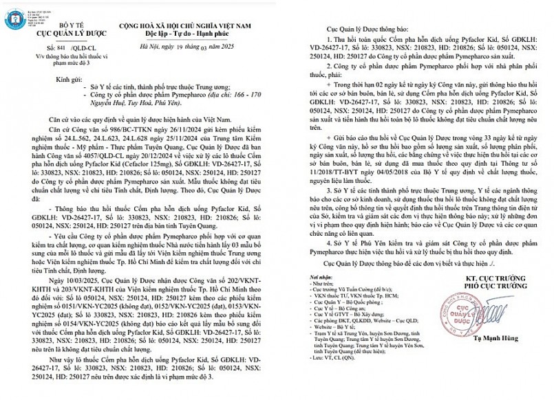 Ngày 10/03/2025, Cục Quản lý Dược nhận được Công văn số 202/VKNTKHTH và 203/VKNT-KHTH của Viện kiểm nghiệm thuốc TP. Hồ Chí Minh theo đó đối với: Số lô 050124, NSX: 250124, HD: 250127 kèm theo các phiếu kiểm nghiệm số 0151/VKN-YC2025 (không đạt), 0152/VKN-YC2025 (đạt), 0153/VKNYC2025 (đạt); Số lô 330823, NSX: 210823, HD: 210826 kèm theo phiếu kiểm nghiệm số 0154/VKN-YC2025 (không đạt) báo cáo kết quả lấy mẫu bổ sung đối với thuốc Cốm pha hỗn dịch uống Pyfaclor Kid, Số GĐKLH: VD-26427-17, Số lô: 330823, NSX: 210823, HD: 210826; Số lô: 050124, NSX: 250124, HD: 250127 nêu trên là không đạt tiêu chuẩn chất lượng.