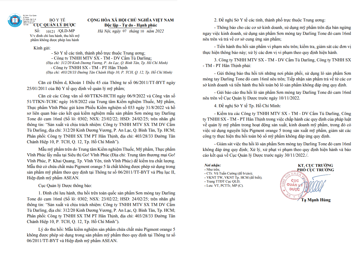 Theo đó, Cục Quản lý Dược đã nhận được công văn của Trung tâm Kiểm nghiệm Thuốc, Mỹ phẩm, Thực phẩm Vĩnh Phúc gửi kèm Phiếu Kiểm nghiệm số 033 ngày 31/8/2022 và hồ sơ liên quan báo cáo kết quả kiểm nghiệm mẫu sản phẩm Sơn móng tay Darling Tone đỏ cam 16ml (Số lô: 0302; NSX: 23/02/22; HSD: 24/02/25; trên nhãn ghi thông tin: “Sản xuất và chịu trách nhiệm: Công ty TNHH MTV SX TM DV Cẩm Tú Darling, địa chỉ: 312/20 Kinh Dương Vương, P. An Lạc, Q. Bình Tân, Tp. HCM; Phân phối: Công ty TNHH SX TM PT Hân Thịnh, địa chỉ: 403/28/33 Đường Tân Chánh Hiệp 10, P. TCH, Q. 12, Tp. Hồ Chí Minh”).