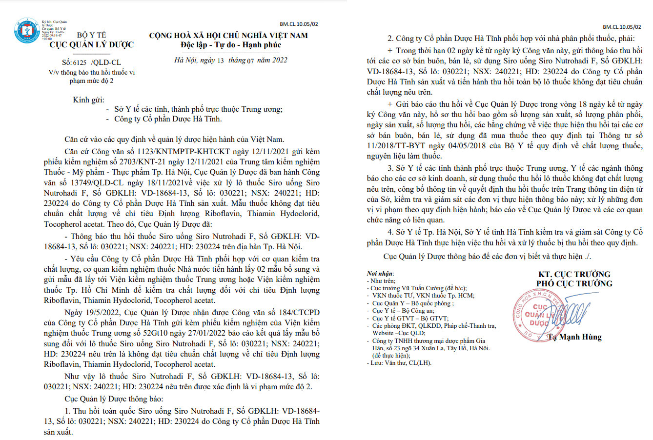 Tiếp đó, ngày 19/5/2022 Cục Quản lý Dược nhận được Công văn số 184/CTCPD của Công ty Cổ phần Dược Hà Tĩnh gửi kèm phiếu kiểm nghiệm của Viện kiểm nghiệm thuốc Trung ương số 52Gt10 ngày 27/01/2022 báo cáo kết quả lấy mẫu bổ sung đối với lô thuốc Siro uống Siro Nutrohadi F, Số lô: 030221; NSX: 240221; HD: 230224 nêu trên là không đạt tiêu chuẩn chất lượng về chỉ tiêu Định lượng Riboflavin, Thiamin Hydoclorid, Tocopherol acetat.