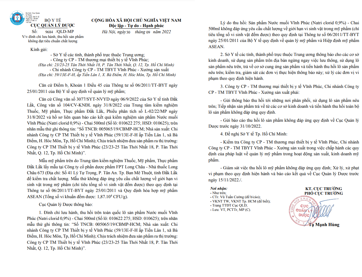 Theo đó, Cục Quản lý Dược đã nhận được Công văn của Trung tâm kiểm nghiệm Thuốc, Mỹ phẩm, Thực phẩm Đắk Lắk, Phiếu phân tích số L-02/22/MP ngày 31/8/2022 và hồ sơ liên quan báo cáo kết quả kiểm nghiệm sản phẩm Nước muối Vĩnh Phúc (Natri clorid 0,9%) - Chai 500ml (Số lô: 010622 275; HSD: 010625); trên nhãn mẫu thử ghi thông tin: “Số TNCB: 005065/19/CBMP-HCM; Nhà sản xuất: Chi nhánh Công ty CP TM Thiết bị y tế Vĩnh Phúc (59/13E-F-H ấp Tiến Lân 1, xã Bà Điểm, H. Hóc Môn, Tp, Hồ Chí Minh); Chịu trách nhiệm đưa sản phẩm ra thị trường: Công ty CP TM Thiết bị y tế Vĩnh Phúc (23/23-25 Tân Thới Nhất 18, P. Tân Thới Nhất, Q. 12, Tp. Hồ Chí Minh)”.